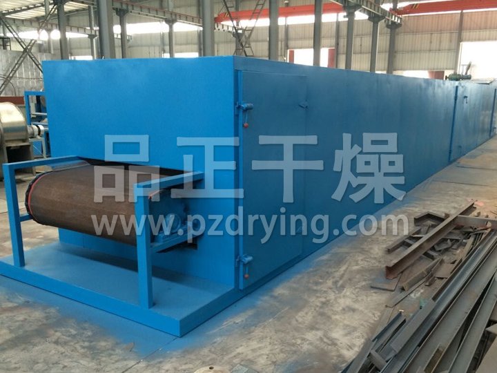 物料由加料器均勻地鋪在網帶上,網帶一般采用12-60目不銹鋼絲網,由傳動裝置拖動在干燥機內移動。干燥機由若干單元組成,每一單元熱風獨立循環,部分尾氣由專門排濕風機排出,廢氣由調節閥控制,熱氣由下往上或由上往下穿過鋪滿物料的網帶完成熱量與質量傳遞的進程,帶走物料水份。網帶緩慢移動,運行速度可根據物料溫度自由調節,干燥后的成品連續落入收料器中。上下循環單元根據用戶需要可靈活配備,單元數量亦可根據需要選取。